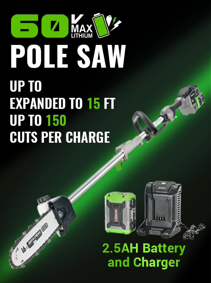 Powered by the NovoCore™ 60V system, this cordless pole saw delivers up to 150 cuts on a single charge. With an extended reach of up to 15 feet (including user height), you can easily prune overhead branches from the ground—no ladder, no hassle, just clean and safe cutting.
